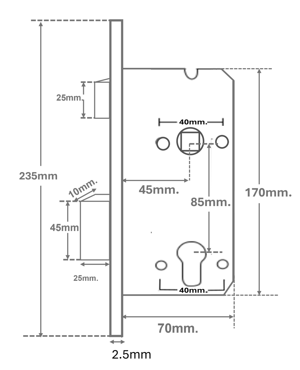 MEDIDAS: 240mm. largo x 170mm. cuerpo x 70mm. profundidad x 25mm. frente