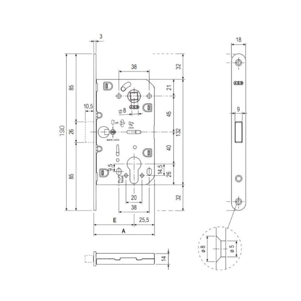 MEDIDAS: Entrada 50mm. /Profundidad 76mm. / Largo Total 196mm. / Frente 22mm.
